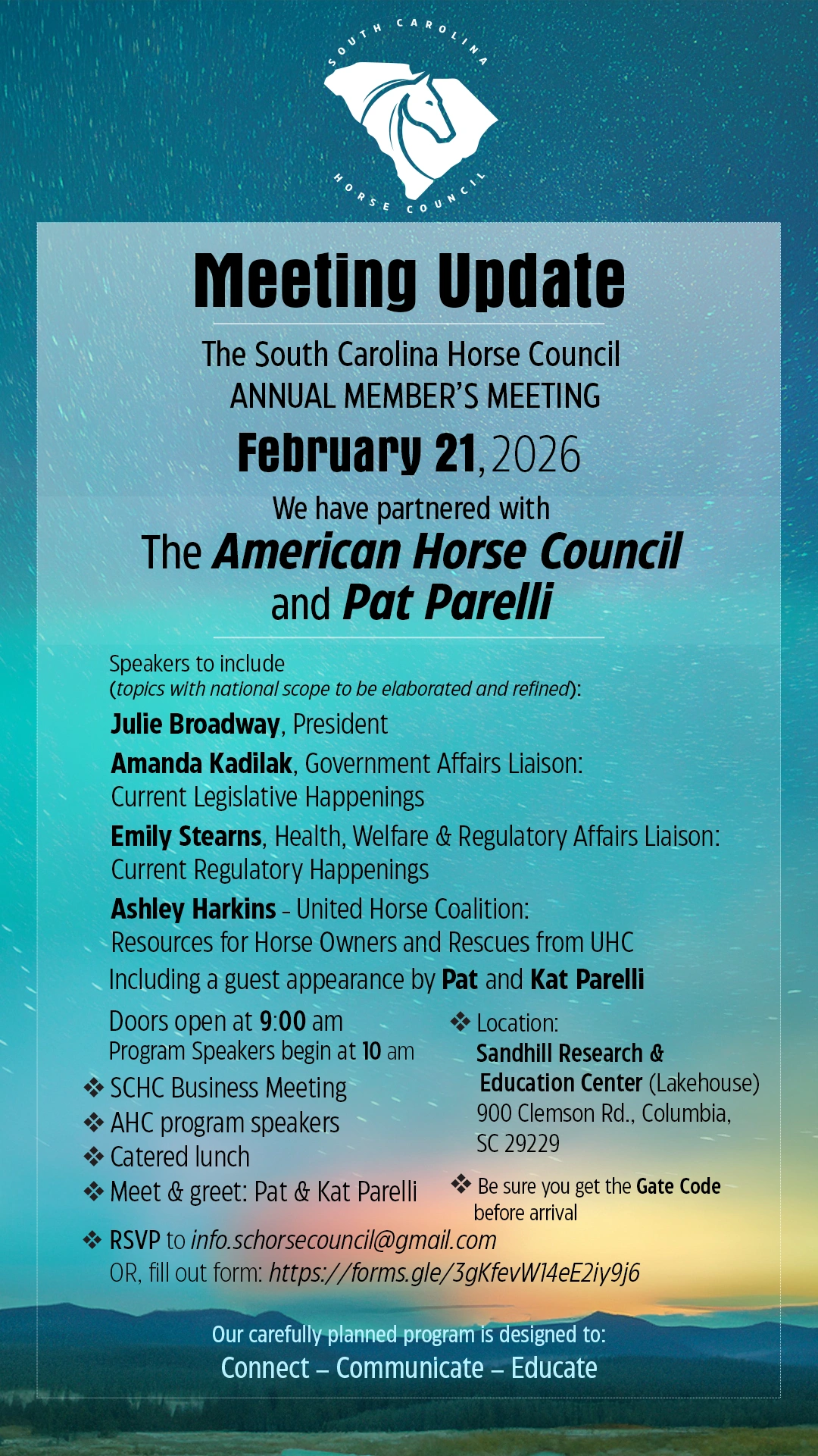 Receive the latest Equine news or important alerts – Join our Newsletter list at info.schorsecouncil@gmail.com