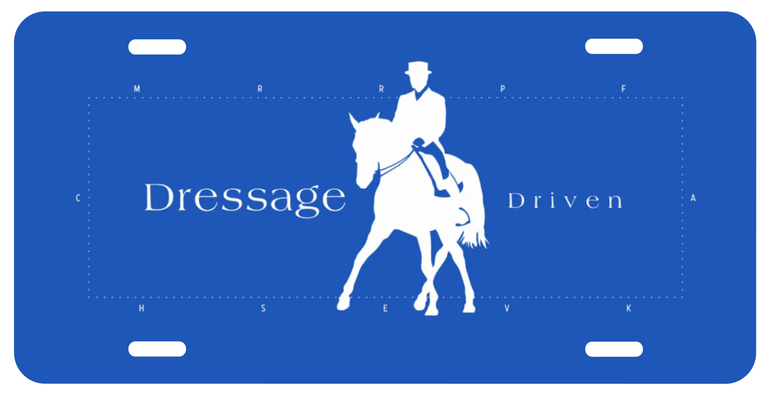 A beautifully design custom Dressage Driven license plate showing an illustration of a dressage rider doing a half-pass.