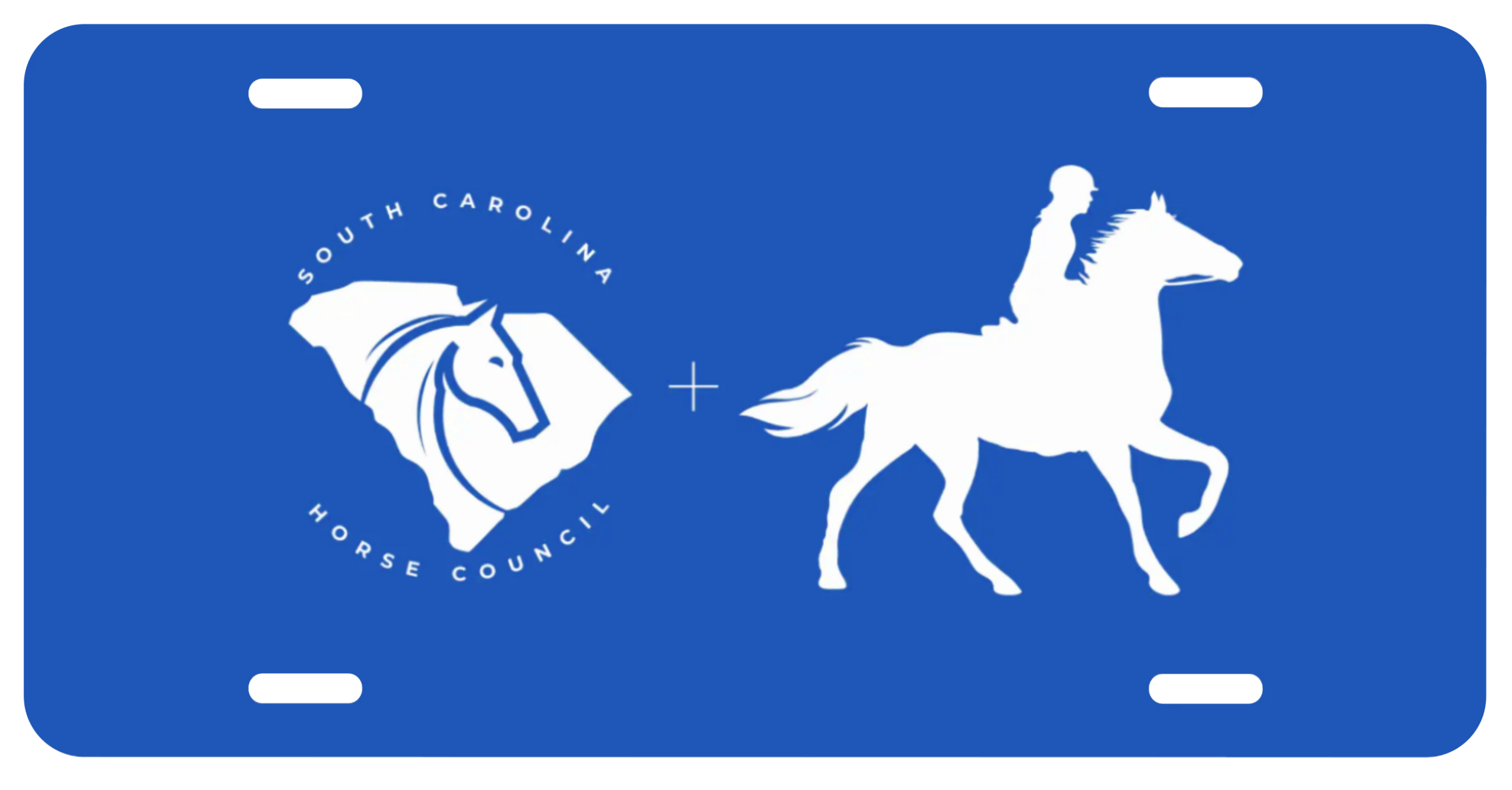 A beautifully design custom license plate showing the SCHC logo in tandem with an illustration of an Endurance rider.